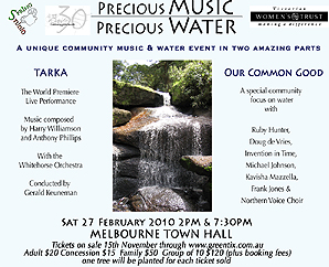 Ant and Harry Williamson's large-scale orchestral work Tarka is due to receive it's World Premier live performance in Melbourne Australia in February 2010 as part of a unique Community Music and Water Event called Precious Music, Precious Water. Ant has assisted with the preparation and checking of the scores for the concert as some parts from the original required re-scoring. Ant is unfortunately unable to attend the concert so his original parts will be played by guitarist Doug De Vries alongside Harry Williamson. Doug and Harry will be joint soloists with the Whitehorse Orchestra, (conducted by Gerald Keuneman) for the performance of Tarka. The concert is taking place at the Melbourne Town Hall on 27th February 2010 and there will be two performances at 2 pm and 7.30 pm. Tickets for the event are on sale now from the Australian Green Tix site - here are direct links to buy tickets for the afternoon and evening performances. |